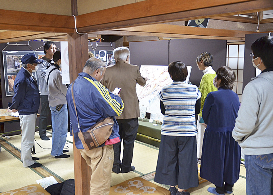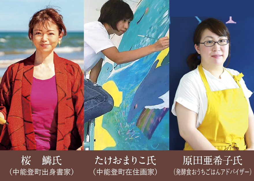 尾関 健二氏の講演会のあとは「どぶろくと女たちの集い」がスタート。中能登町出身の書家「桜鱗(おうりん)」氏による「ほろ酔い書道体験」は、ほろ酔い気分で選ばれた5名が思いのまま「どぶろく」の文字を筆で書き、会場を沸かせました。同じく中能登町在住の画家「たけおまりこ氏」によるどぶろくアート紹介が行われ、時間と共に変化していく色に興味を抱く方が多数おられました。